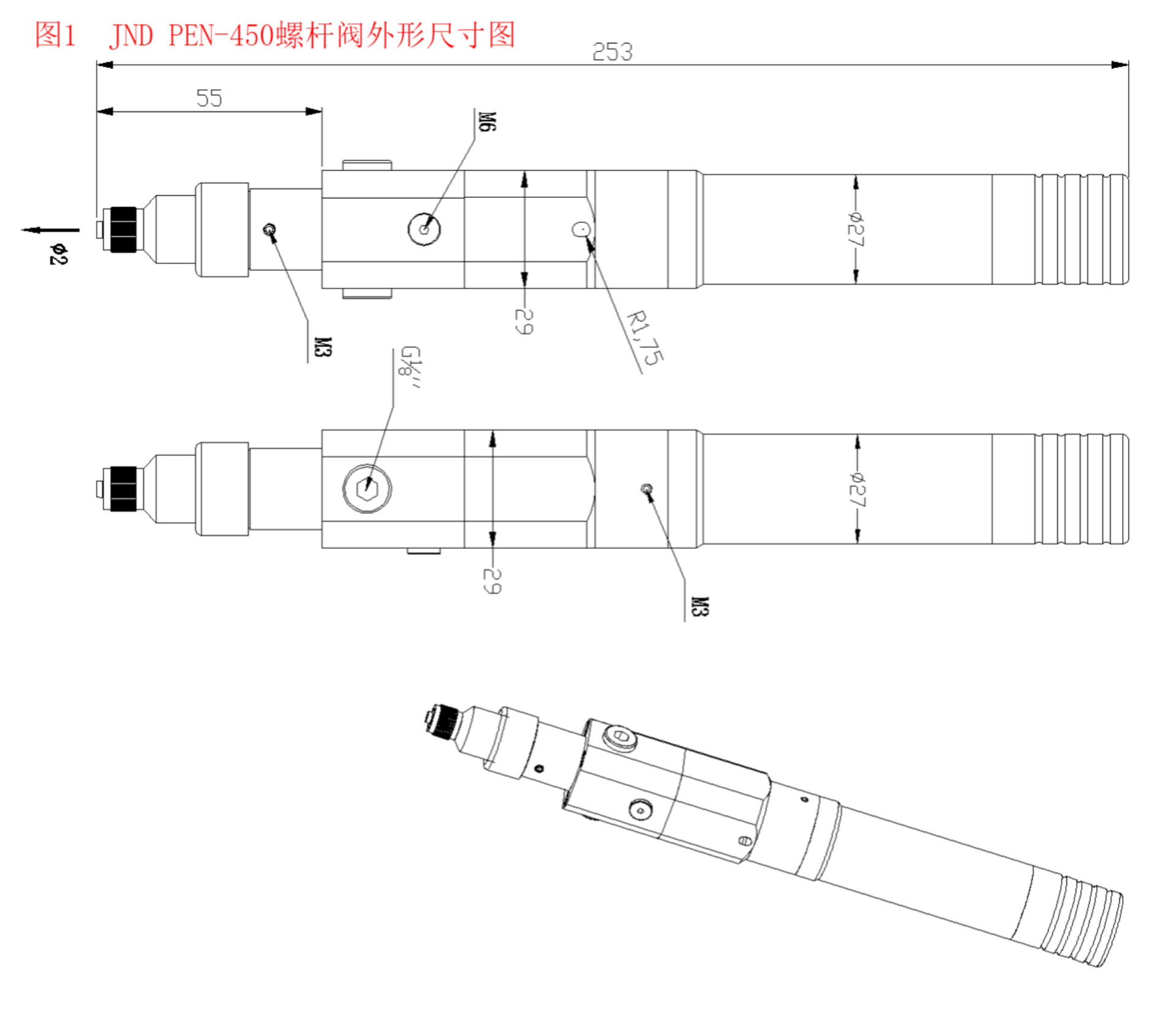 設(shè)備本體尺寸:①螺桿閥: 253(L)mm×33 (φ)mm(具體尺寸見圖1)